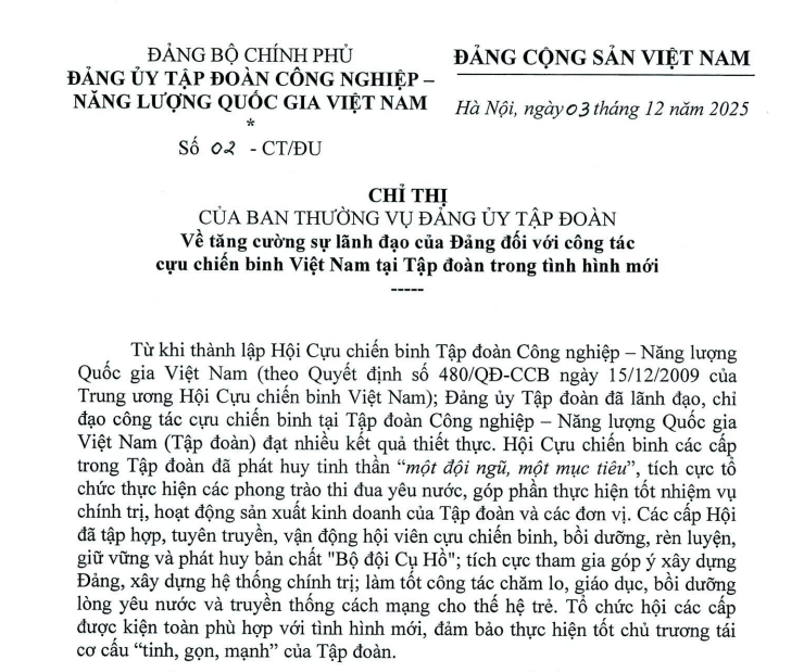CHỈ THỊ CỦA BAN THƯỜNG VỤ ĐẢNG ỦY TẬP ĐOÀN Về tăng cường sự lãnh đạo của Đảng đối với công tác cựu chiến binh Việt Nam tại Tập đoàn trong tình hình mới