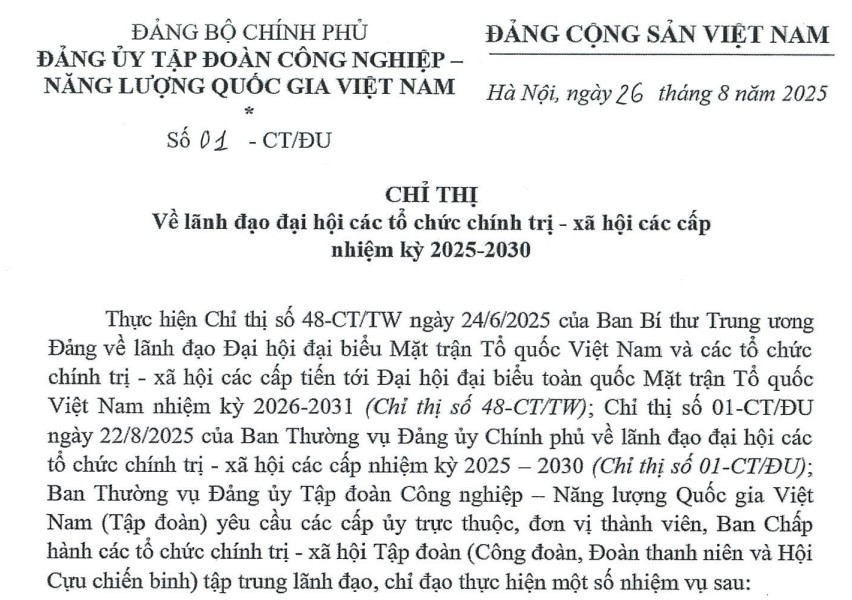 Chỉ thị về lãnh đạo đại hội các tổ chức chính tị - xã hội các cấp nhiệm kỳ 2025-2030.