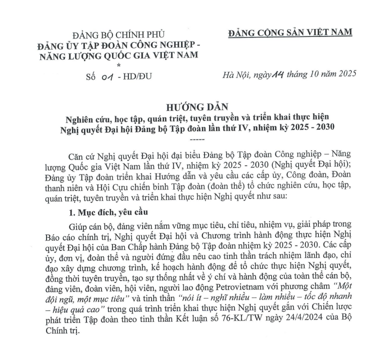 HƯỚNG DẪN: Nghiên cứu, học tập, quán triệt, tuyên truyền và triển khai thực hiện Nghị quyết Đại hội Đảng bộ Tập đoàn lần thứ IV, nhiệm kỳ 2025 - 2030