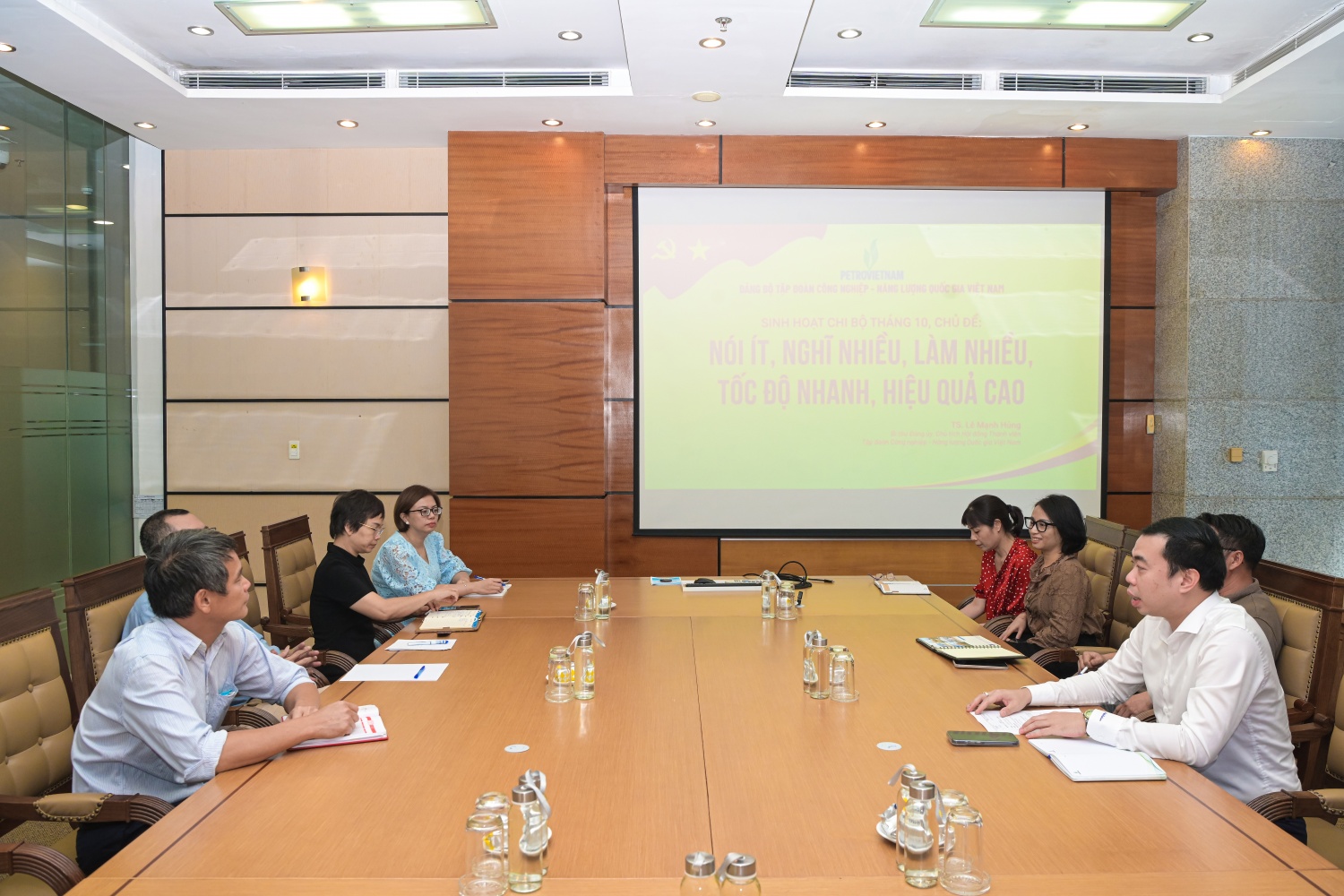 Ngày 3/10, các Chi bộ thuộc Đảng bộ Bộ máy Quản lý và Điều hành (BMQL&ĐH) Tập đoàn Công nghiệp - Năng lượng Quốc gia Việt Nam (Petrovietnam) đã đồng loạt triển khai sinh hoạt Chi bộ, quán triệt tinh thần: “Nói ít - Nghĩ nhiều - Làm nhiều - Tốc độ nhanh - Hiệu quả cao”.
