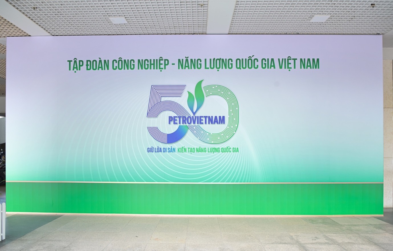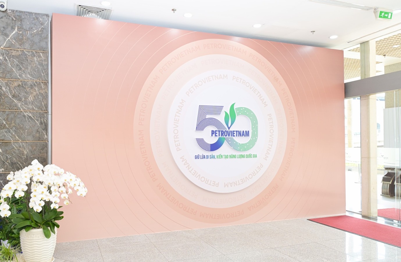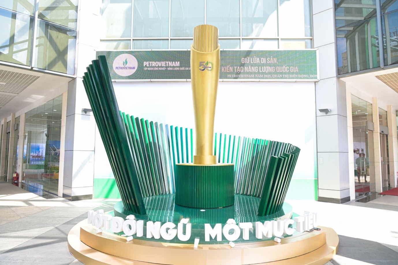 Bộ Logo nổi bật kỷ niệm 50 năm thành lập Petrovietnam tại lối đi tầng 1