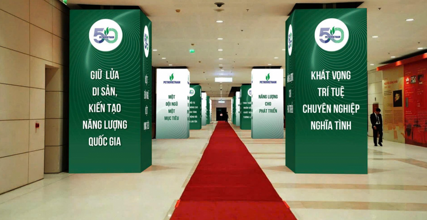 Các cột dọc với logo kỷ niệm 50 năm Petrovietnam tại lối đi đại biểu