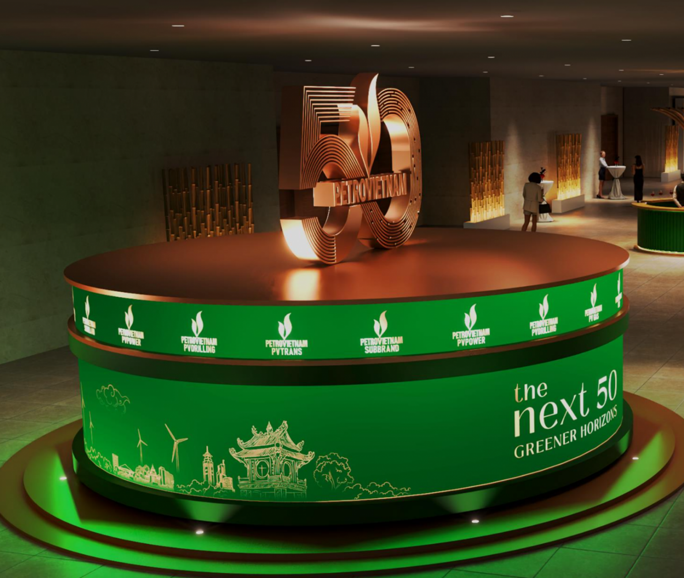 Cùng với đó, tại trụ sở Tập đoàn, các mô hình trang trí mang biểu tượng và logo Petrovietnam cũng được bố trí tại các sảnh tầng 1, 5, 6 và 19, tạo điểm nhấn ấn tượng, góp phần lan tỏa niềm tự hào về thương hiệu và dấu ấn 50 năm xây dựng, phát triển của Petrovietnam.