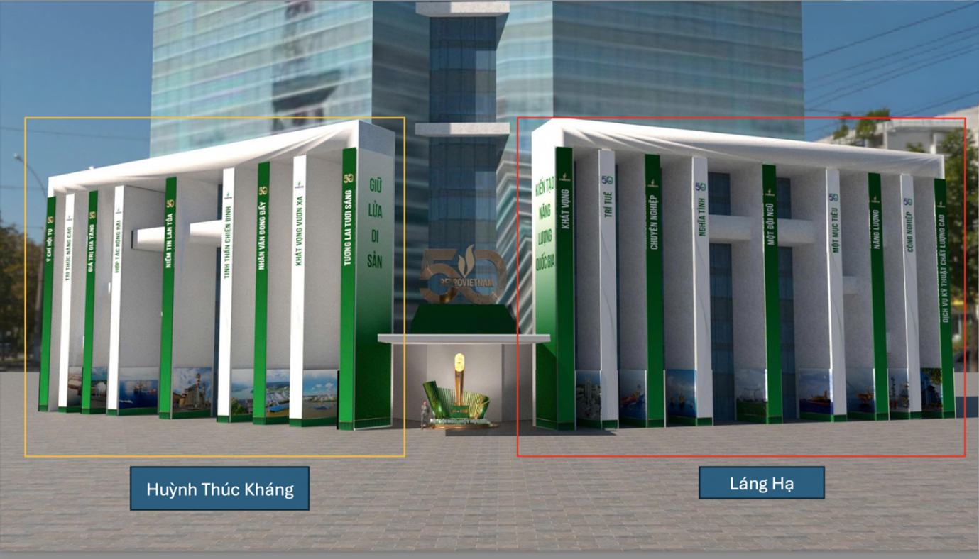 Hai bên các cột là 32 bức ảnh tiêu biểu ghi lại những dấu ấn quan trọng của Petrovietnam trong tất cả các lĩnh vực từ tìm kiếm – khai thác dầu khí, công nghiệp khí, điện, đạm, lọc – hóa dầu, vận tải, dịch vụ kỹ thuật, năng lượng tái tạo và phân phối xăng dầu. Những hình ảnh này không chỉ tái hiện chặng đường phát triển mà còn là niềm tự hào về tầm vóc, thương hiệu Petrovietnam.
