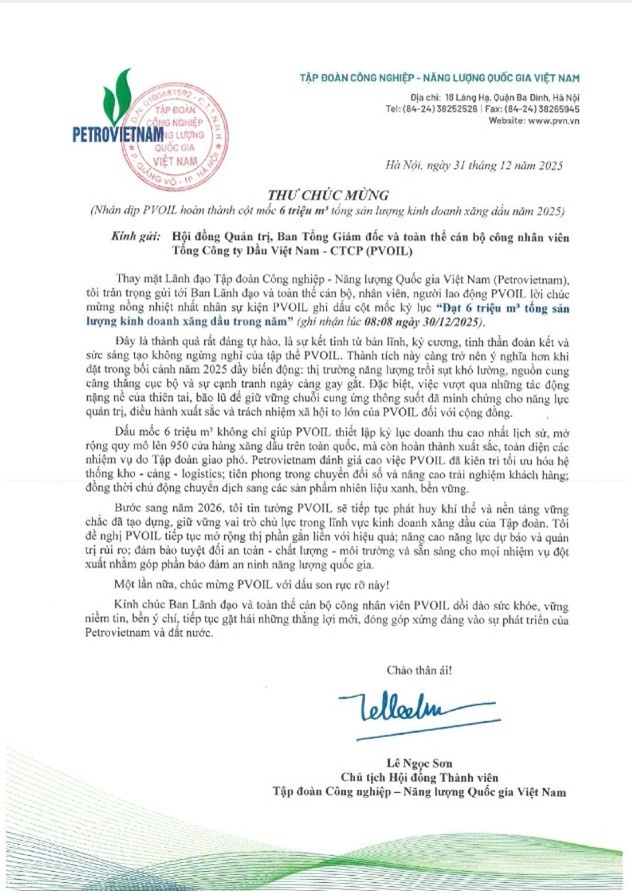 Chủ tịch HĐTV Petrovietnam Lê Ngọc Sơn gửi thư chúc mừng PVOIL nhân dịp đạt mốc sản lượng 6 triệu m3