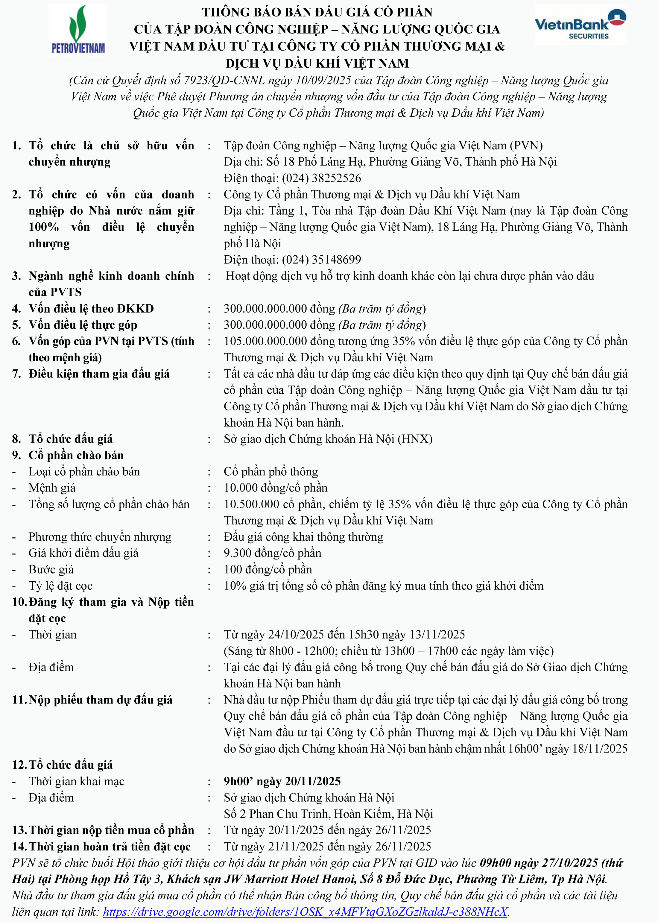 THÔNG BÁO: Bán đấu giá cổ phần của Tập đoàn Công nghiệp – Năng lượng quốc gia Việt Nam đầu tư tại Công ty Cổ phần Thương mại & Dịch vụ dầu khí Việt Nam
